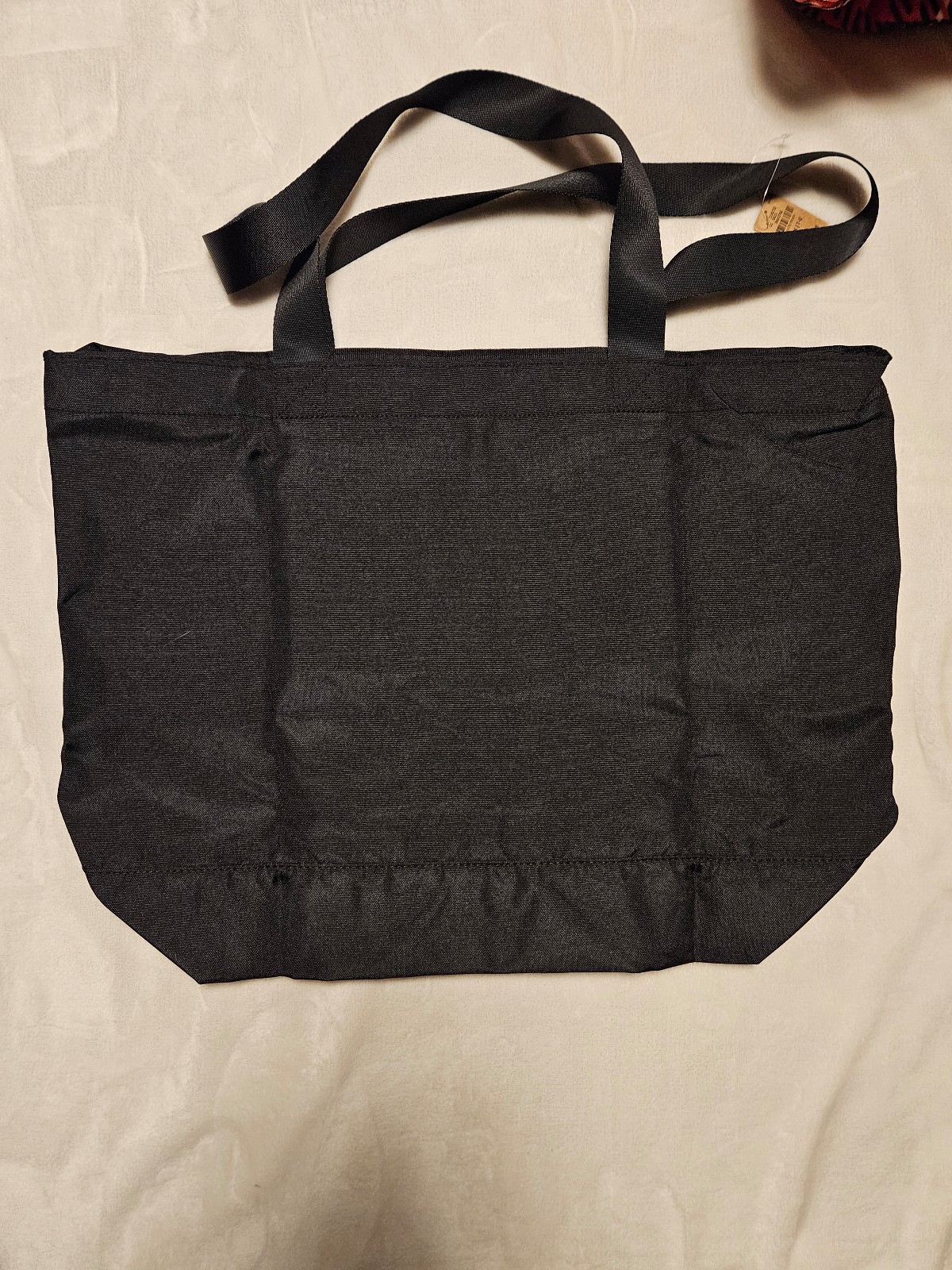 Black cotton tote with love pink logo, double carry straps, large main picket with zip closure, slip pocket inside large main pocket